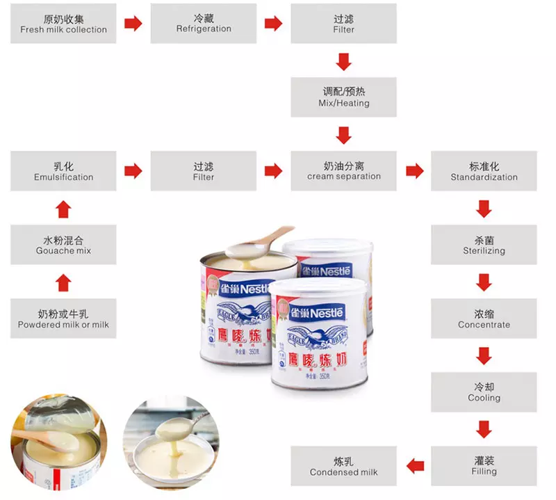 ,這是整個生產(chǎn)過程中的關(guān)鍵步驟。過剩的乳糖如果結(jié)晶過大,會導(dǎo)致產(chǎn)品沙礫化,影響口感和品質(zhì)。為了避免這一問題,我們通過快速攪拌和冷卻控制乳糖結(jié)晶,確保結(jié)晶成小晶體,保持產(chǎn)品的細(xì)膩口感。冷卻后的煉乳被泵送至保存罐,經(jīng)過幾天靜置,使結(jié)晶過程完全完成。甜煉乳呈黃色,具有蛋黃漿的外觀,并可以包裝成小袋或馬口鐵罐裝。